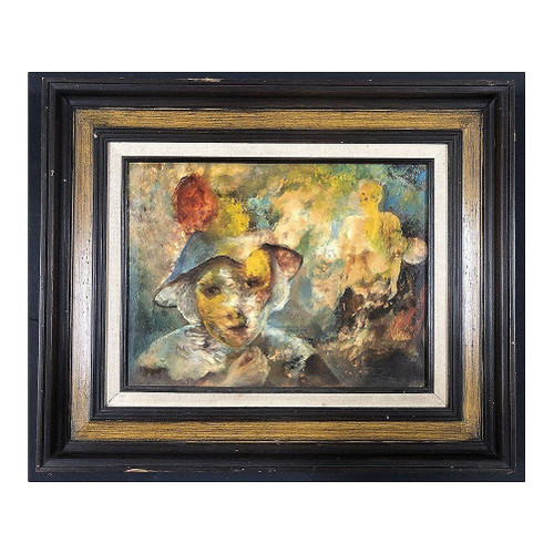 Original oil on canvas impressionist portrait in the style of the works by Raphael De Buck with a near-unsettling surrealistic twist. The expressive brushstrokes and vibrant colors exude a sense of depth and emotion with a shadowy figure looming over a woman in a floral laced hat. The painting comes in its original black and gold wood frame.